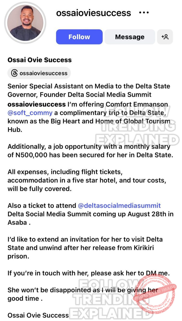 Comfort Emmanson, the lady recently released from Kirikiri Prison following the withdrawal of the Ibom Air case, has received a life-changing offer from Ossai Ovie Success, Senior Special Assistant on Media to the Delta State Governor.