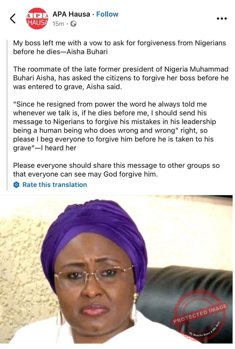 In a widely shared post by APA Hausa, Aisha Buhari revealed that her husband had long expressed his wish to seek forgiveness from the Nigerian people before his passing.