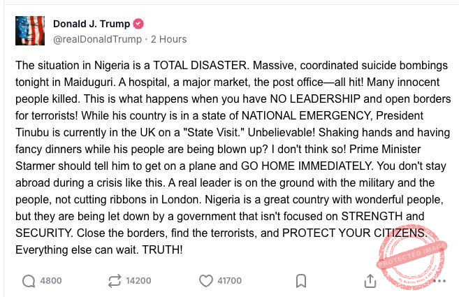 Reacting via his official account on X, Trump described the situation as a “TOTAL DISASTER,” blaming what he termed a lack of leadership and weak border control. He criticised Tinubu’s presence in the United Kingdom during the crisis and urged Keir Starmer to ensure the Nigerian leader returns home immediately.